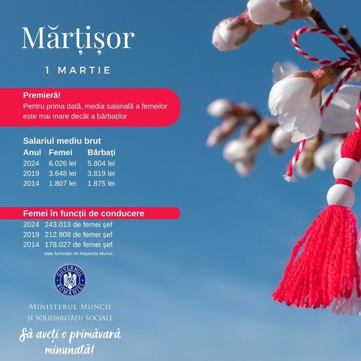 1 Martie vine cu o veste pe care Ministerul Muncii și Solidarității Sociale (MMSS) o anunță cu mare bucurie: decalajele salariale dintre femei și bărbați sunt tot mai reduse. De asemenea, numărul femeilor care acced pe funcții de conducere este tot mai mare în România, după cum arată datele Inspecției Muncii, instituție aflată în subordinea MMSS.