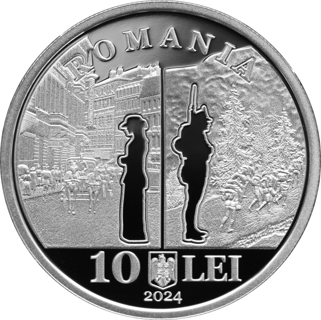 Aversul monedei prezintă o compoziție inspirată din romanul „Ultima noapte de dragoste, întâia noapte de război” de Camil Petrescu, inscripția „ROMANIA” în arc de cerc, stema României, valoarea nominală „10 LEI” și anul de emisiune „2024”.