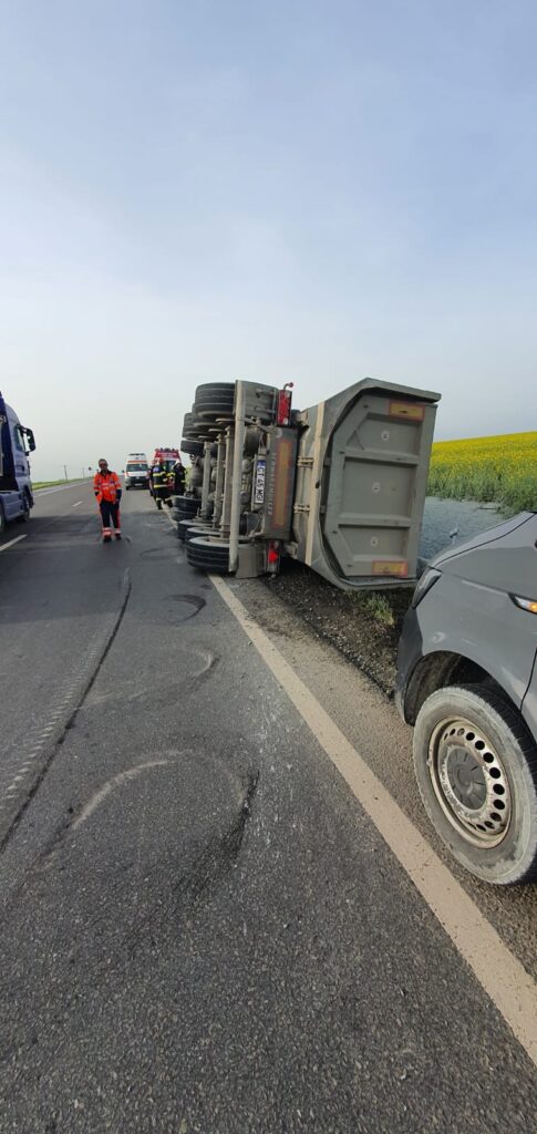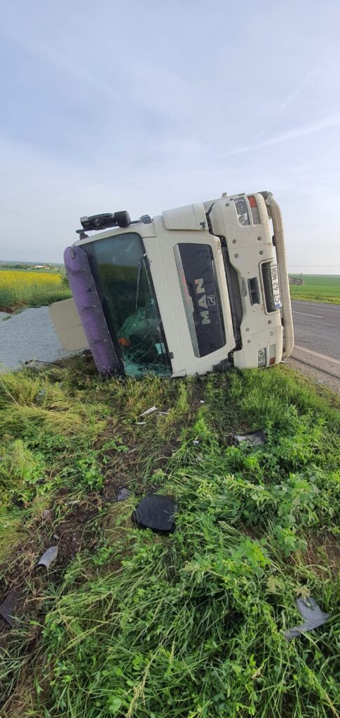 A fost vorba de un tir încărcat cu piatră, care s-a răsturnat în afara părții carosabile. În urma evenimentului rutier a rezultat o victimă conștientă, neîncarcerată.
