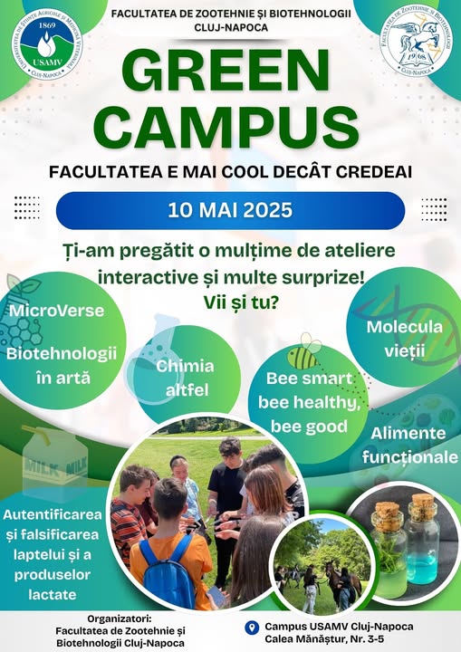 „Green Campus”, eveniment găzduit de USAMV Cluj-Napoca (Facultatea de Zootehnie și Biotehnologii) pentru sute de liceeni, care vor învăța despre biotehnologii în artă, falsuri alimentare, biotopul acvacol, comportamentul și bunăstarea animalelor sau viața albinelor și a viermilor de mătase.
