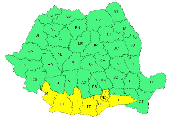 Administraţia Naţională de Meteorologie a emis, marţi, noi atenţionări Cod galben de caniculă, ce vizează, în următoarele două zile, zone din nouă judeţe şi Municipiul Bucureşti.