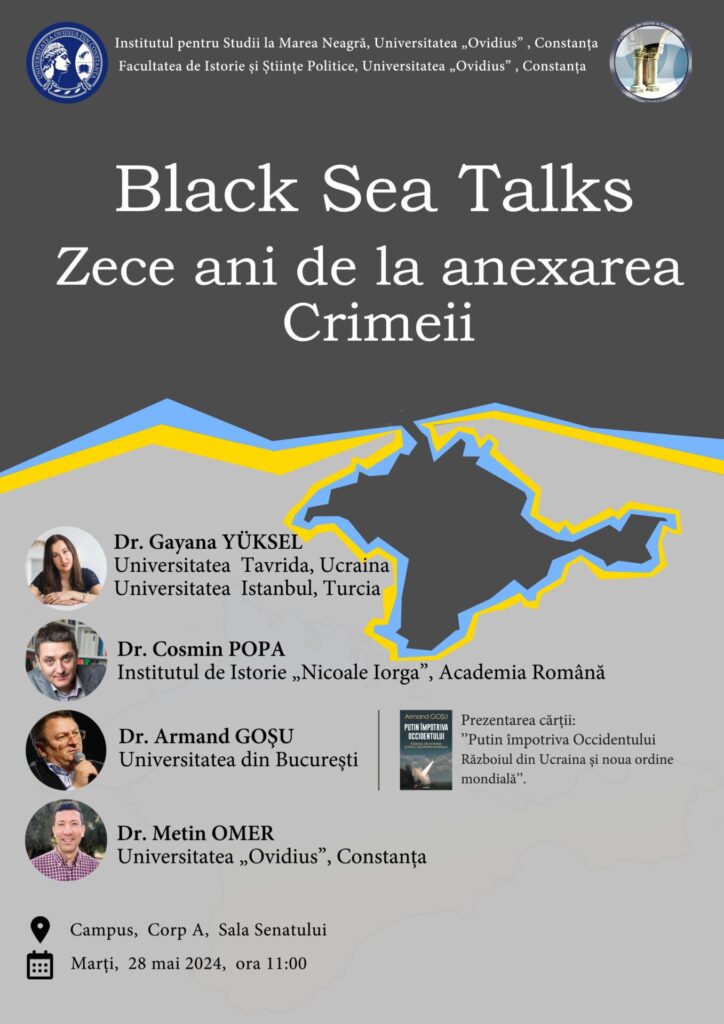 Facultatea de Istorie și Științe Politice (FISP) din cadrul Universității „Ovidius” din Constanța, în parteneriat cu Institutul pentru Studii la Marea Neagră, organizează, marți, 28 mai 2024, conferința „Black Sea Talks. Zece ani de la anexarea Crimeii”.