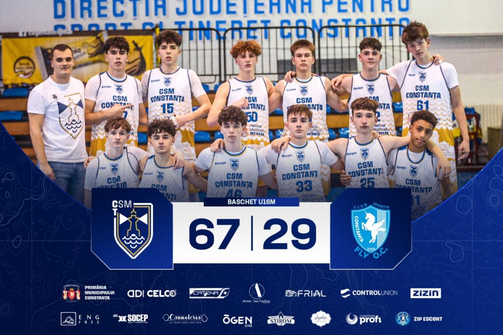 CSM Constanța U16 Masculin a obținut o victorie categorică în cea mai recentă etapă a Campionatului Național. În Sala Complexului Sportiv Tomis din strada Flămânda, echipa de la malul mării s-a impus cu Fly OC Constanța cu 67-29 la capătul unui meci în care a dominat permanent ostilitățile pe tabelă.
