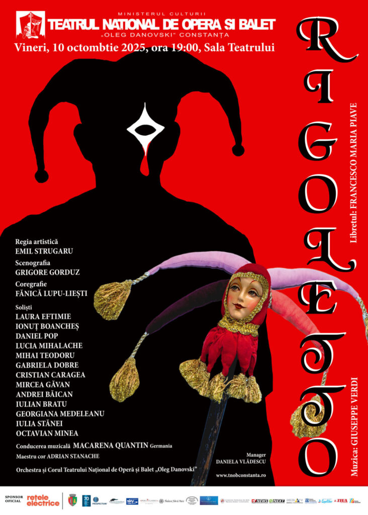 Vineri, 10 octombrie 2025, publicul este invitat la spectacolul de operă „Rigoletto” de Giuseppe Verdi. Regia artistică este semnată de EMIL STRUGARU, scenografia de GRIGORE GORDUZ, iar coregrafia de FĂNICĂ LUPU-LIEȘTI. Din distribuție fac parte: LAURA EFTIMIE, IONUȚ BOANCHEȘ, DANIEL POP, LUCIA MIHALACHE, MIHAI TEODORU, GABRIELA DOBRE, CRISTIAN CARAGEA, MIRCEA GĂVAN, ANDREI BĂICAN, IULIAN BRATU, GEORGIANA MEDELEANU, IULIA STĂNEI și OCTAVIAN MINEA. Conducerea muzicală este asigurată de dirijoarea MACARENA QUANTIN (Germania), iar pregătirea corului este coordonată de ADRIAN STANACHE. Spectacolul este susținut de Orchestra și Corul Teatrului Național de Operă și Balet „Oleg Danovski”.