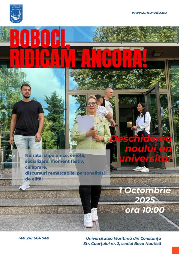 Universitatea Maritimă din Constanța (UMC) invită întreaga comunitate academică la ceremonia de deschidere a noului an universitar, care va avea loc miercuri, 1 octombrie 2025, începând cu ora 10:00, în Aula A201, situată în incinta Bazei Nautice, str. Cuarțului nr. 2, pe malul lacului Siutghiol.