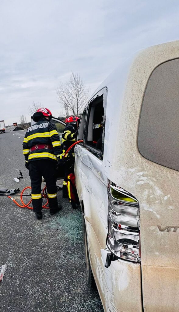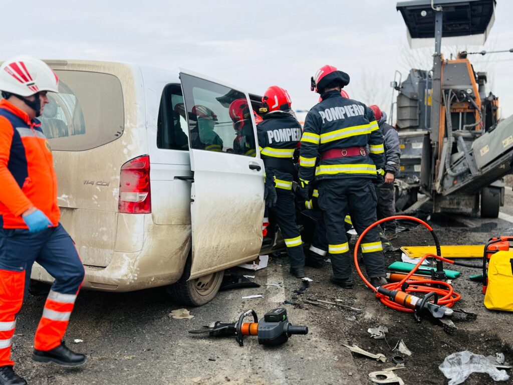 În eveniment au fost implicate un microbuz, un utilaj care efectua lucrări de întreținere a părții carosabile și un autoturism.