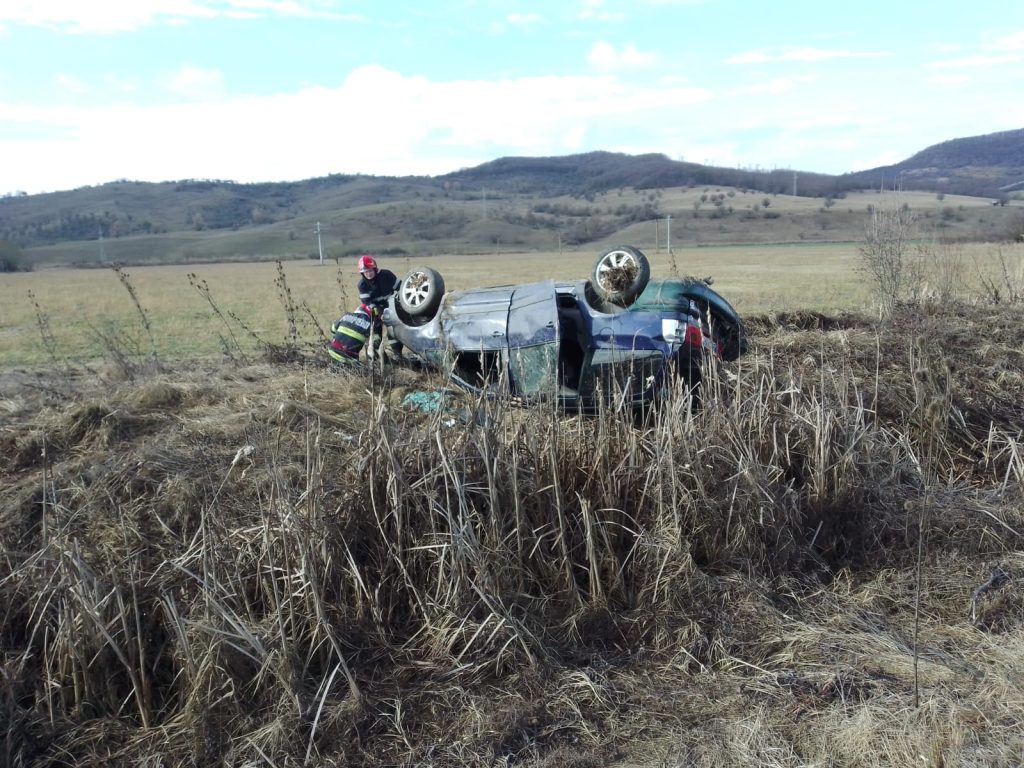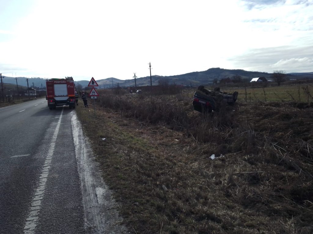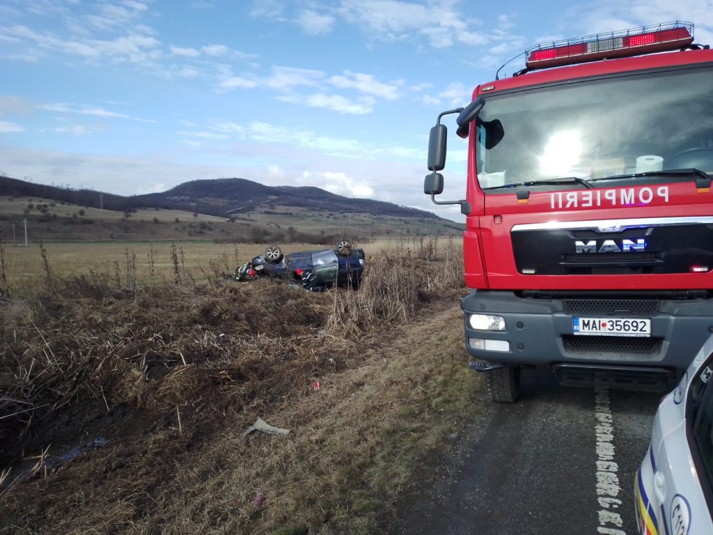 Pompierii militari au intervenit la un accident rutier, în urma căruia un autoturism s-a răsturnat (două autoturisme implicate) fără persoane încarcerate anunțate, pe raza localității Teaca.