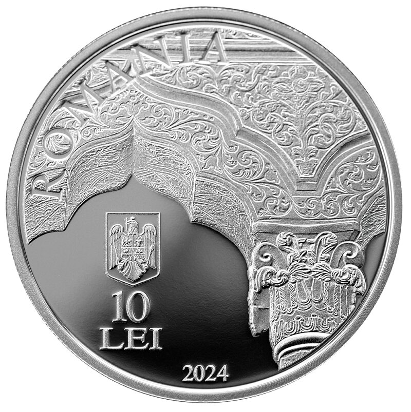 Aversul monedei din argint prezintă un element decorativ în stil brâncovenesc din pridvorul bisericii Stavropoleos, inscripția „ROMANIA” în arc de cerc, stema României, valoarea nominală „10 LEI” și anul de emisiune „2024”.