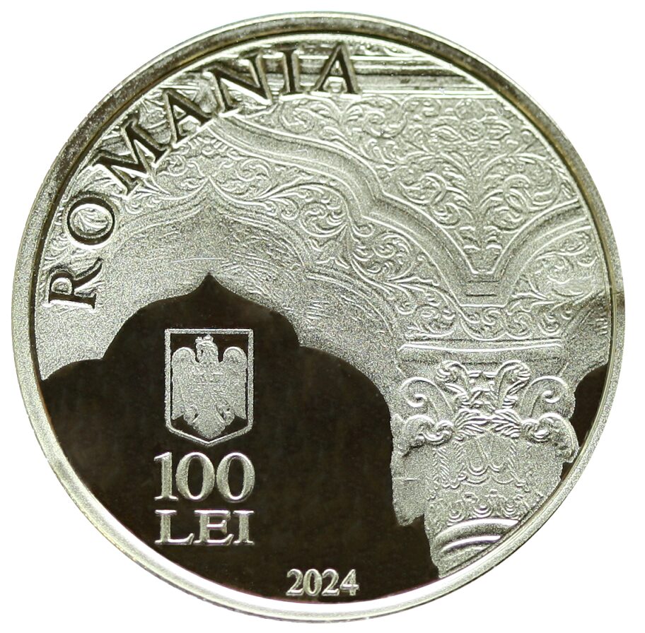 Aversul monedei din aur prezintă un element decorativ în stil brâncovenesc din pridvorul bisericii Stavropoleos, inscripția „ROMANIA” în arc de cerc, stema României, valoarea nominală „100 LEI” și anul de emisiune „2024”.