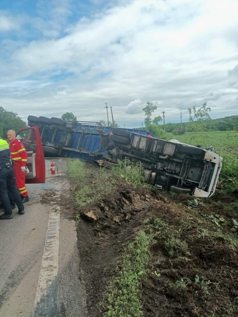 Un accident rutier s-a produs astăzi, pe raza localității Drăgănești-Vlașca, la ieșirea spre Bujoreni, unde un autotren care transporta cereale s-a răsturnat pe carosabil. În urma evenimentului, șoferul TIR-ului, un bărbat în vârstă de aproximativ 34 de ani, a fost rănit.