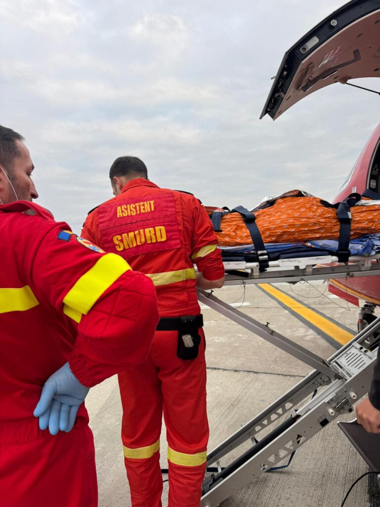 Transportul se realizează cu avionul SMURD al IGAv, pacientul fiind monitorizat permanent de echipa medicală pe durata deplasării.