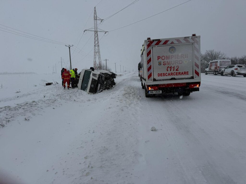 Un microbuz cu pasageri s-a răsturnat în afara părții carosabile, pe DN5, în zona localității Plopșoru, pe sensul de mers către Giurgiu.