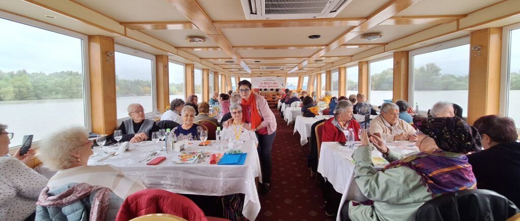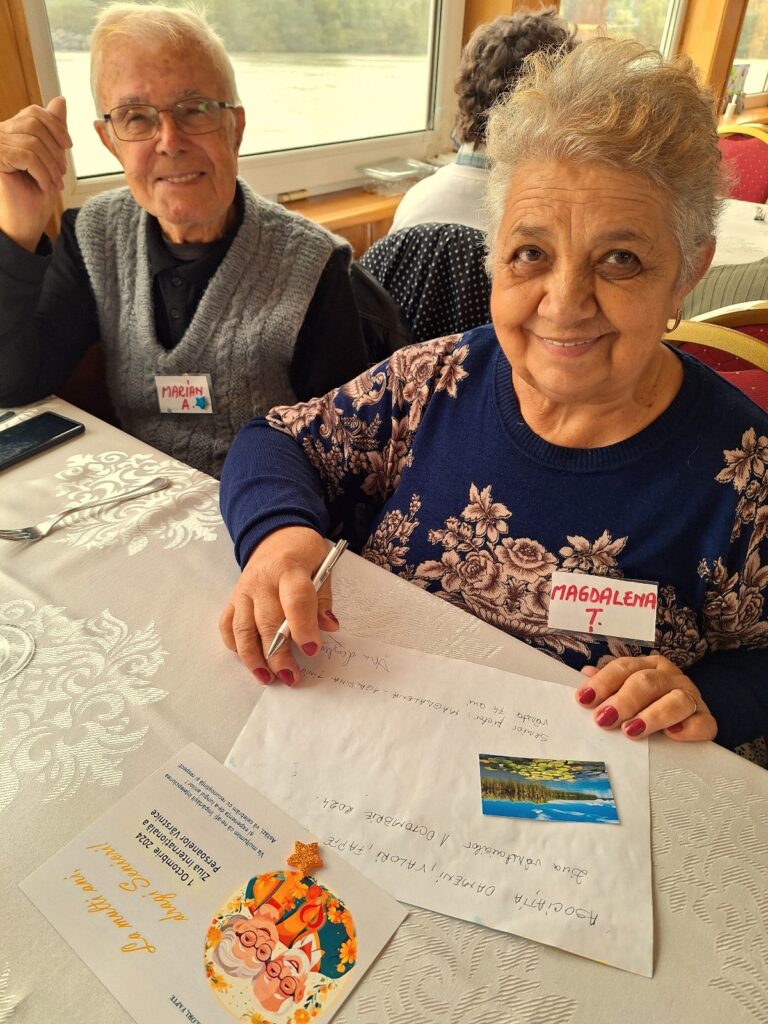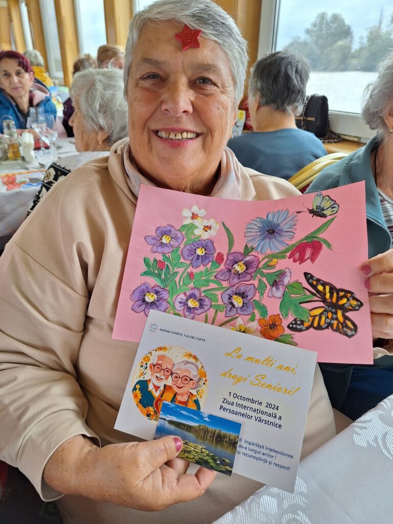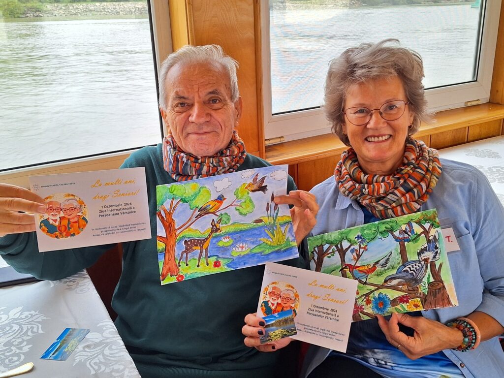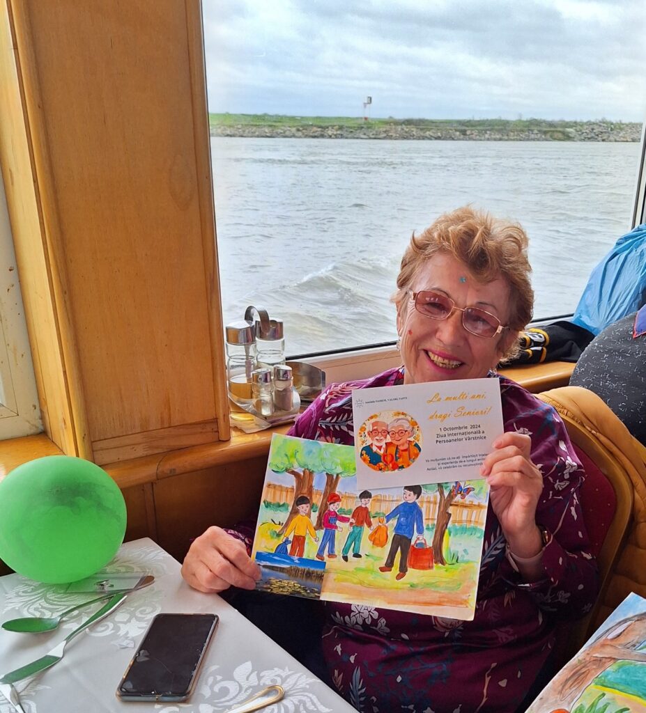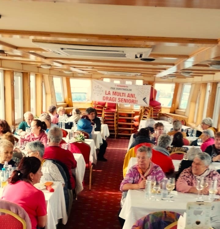 Ziua de 1 Octombrie a fost celebrată la bordul vaporului cu un prânz pescăresc savuros, însoțit de muzică, dans, cadouri, fotografii și multe povești depănate. Spre seară, atmosfera a devenit și mai festivă, seniorii fiind surprinși cu carduri-felicitare, cadouri și un tort mare, oferit de Asociație. Această seară festivă a fost un moment de bucurie și încântare, plin de zâmbete și emoții, care a transformat ziua într-o amintire de neuitat pentru toți participanții.