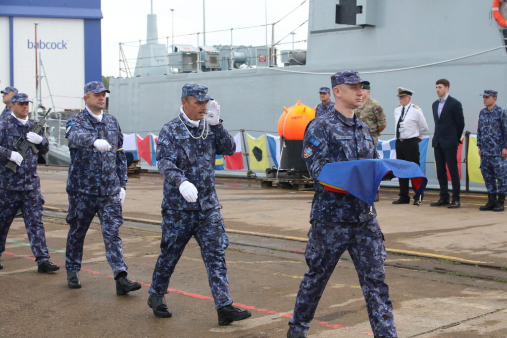 Vânătorul de mine M 270 „Sublocotenent Ion Ghiculescu” a primit primul pavilion al navei, odată cu intrarea în serviciul Forțelor Navale Române, în cadrul unei ceremonii care a avut loc miercuri, 27 septembrie, în portul britanic Rosyth, Scoția, în prezența locțiitorului șefului Statului Major al Forțelor Navale, contraamiral de flotilă Marcel Neculae, a reprezentanților autorităților militare ale Regatului Unit al Marii Britanii și al Irlandei de Nord, a reprezentanților șantierului naval constructor Babcock și a membrilor echipajului navei.