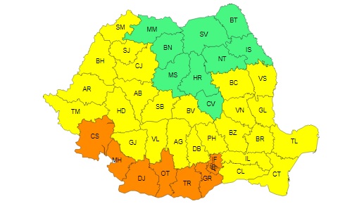 COD PORTOCALIU de caniculă și disconfort termic accentuat – valabil astăzi, 2 august: În județele Caraș-Severin, Mehedinți, Dolj, Olt, Teleorman, Giurgiu, Ilfov și municipiul București va fi caniculă, iar temperaturile maxime vor fi în general de 38…39 de grade. Disconfortul termic va fi accentuat, iar indicele temperatură-umezeală (ITU) va depăși pragul critic de 80 de unități. Minimele termice nu vor coborî sub 20 de grade, astfel că vor caracteriza o noapte tropicală.