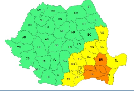 COD PORTOCALIU de caniculă și disconfort termic accentuat – valabil mâine, 3 august: În județele Călărași, Ialomița, Brăila și în partea continentală a județului Constanța va fi caniculă, iar temperaturile maxime vor fi de 38…39 de grade. Disconfortul termic va fi accentuat, iar indicele temperatură-umezeală (ITU) va depăși pragul critic de 80 de unități. Minimele termice nu vor coborî sub 20 de grade, astfel că vor caracteriza o noapte tropicală.