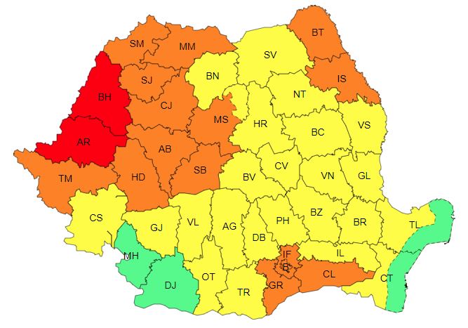 O avertizare Cod roşu de caniculă va fi în vigoare în judeţele Arad şi Bihor, unde maximele vor ajunge la 38 de grade. Va fi disconfort termic deosebit de accentuat, iar ITU va depăşi pragul critic de 80 de unităţi. Minimele, cuprinse între de 18 şi 23 de grade, local vor caracteriza o noapte tropicală.