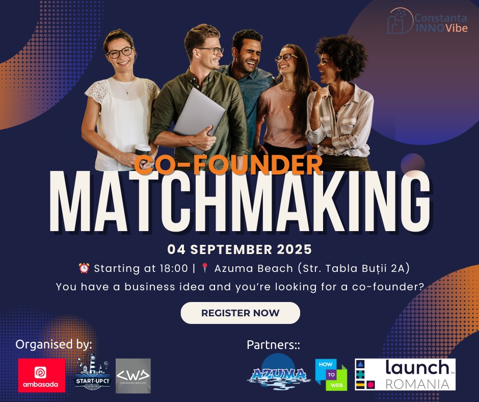 Evenimentul va avea lor pe 4 septembrie, începând ora 18:00 la Azuma Beach, iar cei interesați trebuie să completeze un formular de înscriere: (Înscriere la Co-Founder Matchmaking)