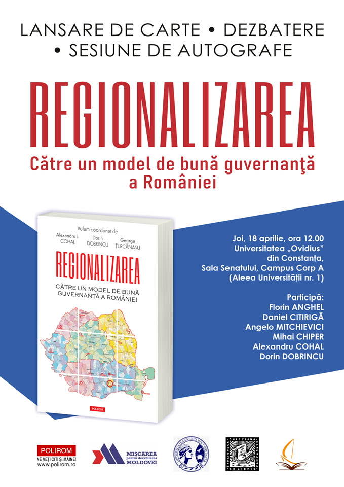 Facultatea de Istorie și Științe Politice (FISP), din cadrul Universității „Ovidius” din Constanța, organizează joi, 18 aprilie 2024, lansarea volumului „Regionalizarea. Către un model de bună guvernanță a României”, coordonat de Alexandru L. Cohal, Dorin Dobrincu și George Ţurcănașu, publicat la Editura Polirom.