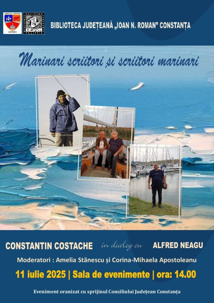 Vineri, 11 iulie 2025, la ora 14.00, la Biblioteca Județeană „Ioan N. Roman” Constanța va avea loc dezbaterea cu tema „Marinari scriitori și scriitori marinari” susținută de scriitorul și traducătorul Alfred Neagu și de romancierul Constantin Costache, membru al Filialei Dobrogea a Uniunii Scriitorilor din România.