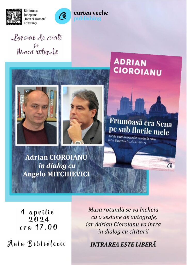 Masă rotundă la Biblioteca Județeană „Ioan N. Roman” Constanța. Evenimentul, care are loc joi, 4 aprilie 2024, la ora 17.00, în Aula Bibliotecii, a fost realizat în colaborare cu Editura Curtea Veche Publishing, cu ocazia lansării jurnalului „Frumoasă era Sena pe sub florile mele. Notele unui ambasador român la Paris între Bataclan’15 și COVID-19” (Curtea Veche Publishing House, 2023) al scriitorului Adrian Cioroianu. Istoricul și criticul literar Prof. univ. dr. habil. Angelo Mitchievici, directorul Bibliotecii, va fi amfitrionul și partenerul de dialog al scriitorului.