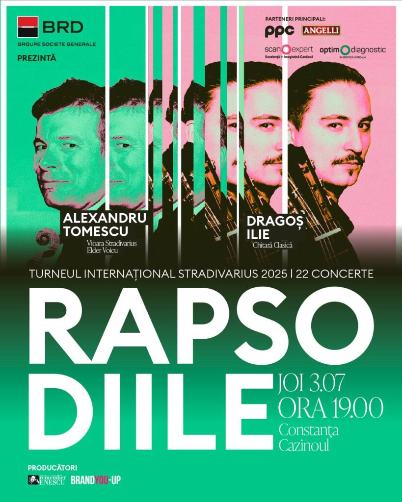 Celebrul violonist Alexandru Tomescu va concerta pe 3 iulie în sala de spectacole a Cazinoului din Constanța în cadrul celei de-a XVIII-a ediții a Turneului Stradivarius. „RAPSODIILE” – o transcripție pentru vioară și chitară clasică semnată de Dragoș Ilie a celebrelor Rapsodii ale lui George Enescu și „Rapsody in Blue” a lui George Gershwin vor răsuna în sala de concerte a Cazinoului din Constanța.