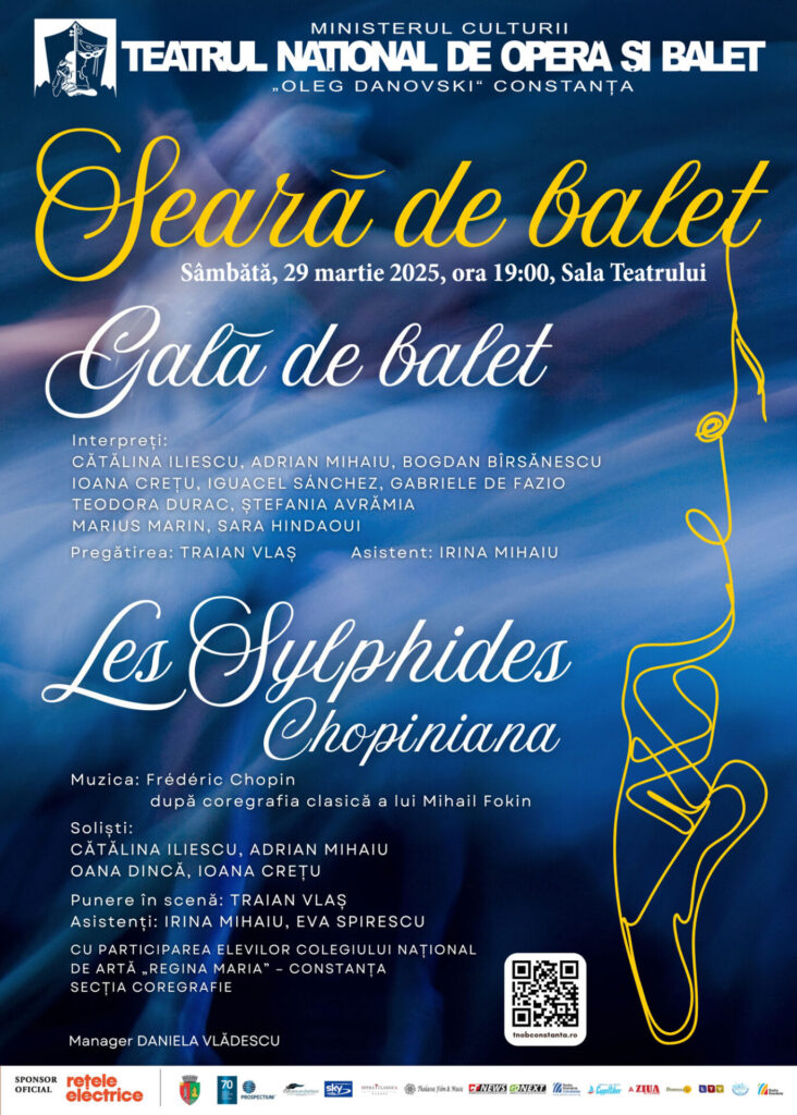 În această săptămână, Teatrul Național de Operă și Balet „Oleg Danovski” prezintă spectacolul „Seară de balet” (Gală de balet și Les Sylphides – Chopiniana). Biletele pot fi achiziționate de pe www.tnobconstanta.ro/bilete și de la Agenția Teatrului.