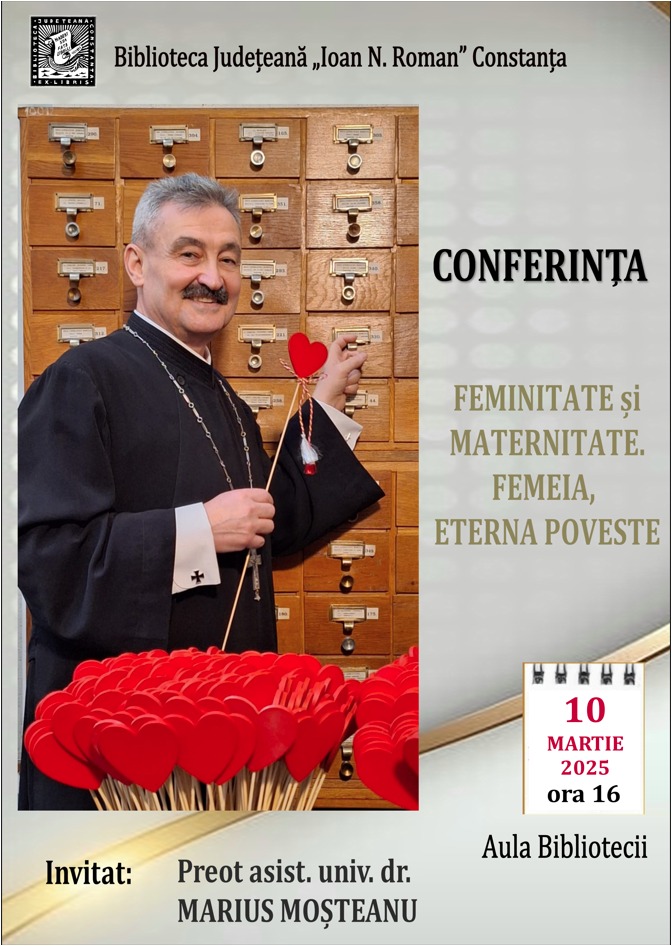 Biblioteca Județeană „Ioan N. Roman” din Constanța găzduiește, pe 10 martie 2025, începând cu ora 16:00, cea de-a cincea conferință susținută de Părintele Marius Moșteanu, având ca temă „Feminitate și maternitate / Femeia, eterna poveste”.
