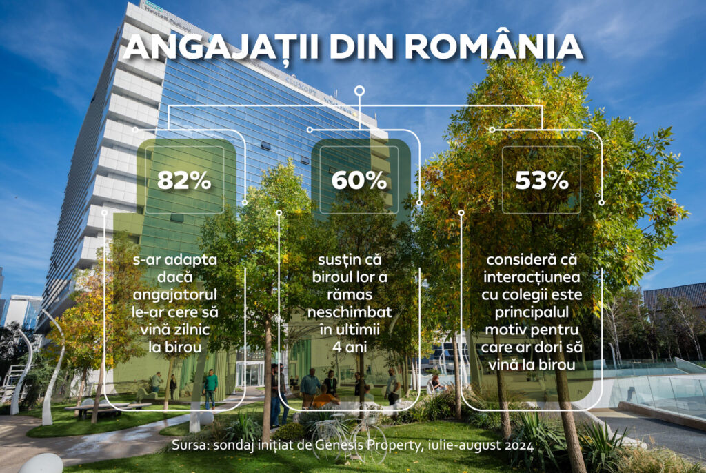 Reîntoarcerea la birou a devenit un fenomen tot mai evident în acest an, iar angajații se adaptează treptat la modul de lucru de dinainte de pandemie. Peste 82% dintre angajați nu ar avea nicio problemă să lucreze zilnic de la birou dacă angajatorul ar decide acest mod de lucru în viitor și, chiar dacă o parte dintre ei recunosc că nu le-ar fi ușor să renunțe la lucrul de la distanță, s-ar adapta destul de rapid, potrivit unui sondaj realizat recent de Genesis Property în rândul a 1.168 de respondenți la nivel național.