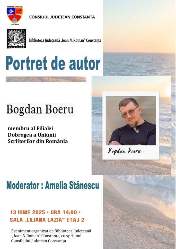 „Pe 13 iunie 2025, la Biblioteca Județeană „Ioan N. Roman” Constanța, ora 14,00, când vă așteptăm la „Portret de autor cu Bogdan Boeru” poate că ar fi mai simplu și mai ușor, fără îndoială, să „povestim” ce nu a putut realiza invitatul nostru, pentru că, ne temem că, trecând în revistă întreaga operă literară a lui Bogdan Boeru, timpul nu va avea răbdare cu noi”, au transmis reprezentanții bibliotecii.