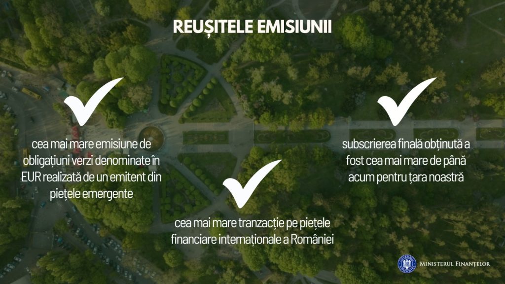 Maturitatea de 12 ani reprezintã cea mai mare tranșã verde denominatã în EUR lansatã pânã acum de cãtre un emitent din piețele emergente (instrumente financiare de datorie ESG). De asemenea, tranzacția reprezintã cea mai mare emisiune de obligațiuni verzi denominate în EUR realizatã de un emitent din piețele emergente. Nu în ultimul rând, emisiunea a fost cea mai mare tranzacție pe piețele financiare internaționale a României, iar subscrierea finalã obținutã a fost cea mai mare de pânã acum pentru țara noastrã.