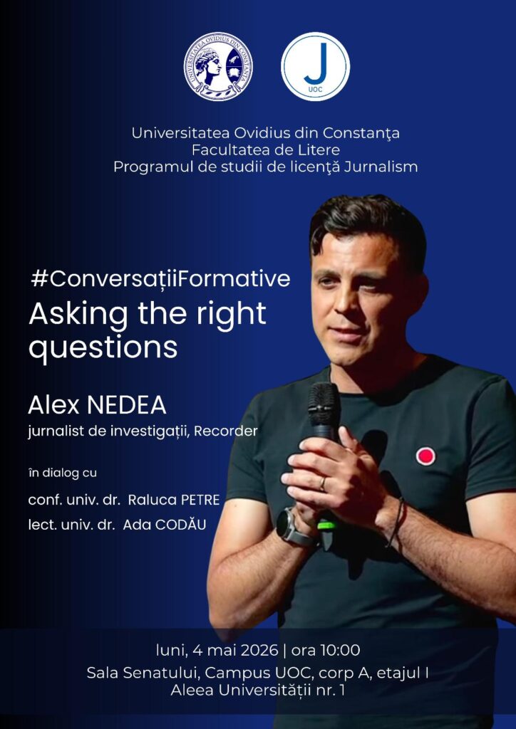 Programul de studii de licență Jurnalism din cadrul Facultății de Litere a Universității „Ovidius” din Constanța (UOC) organizează luni, 4 mai 2026, evenimentul intitulat „Asking the right questions”, susţinut de jurnalistul de investigaţii Alex Nedea de la Recorder.