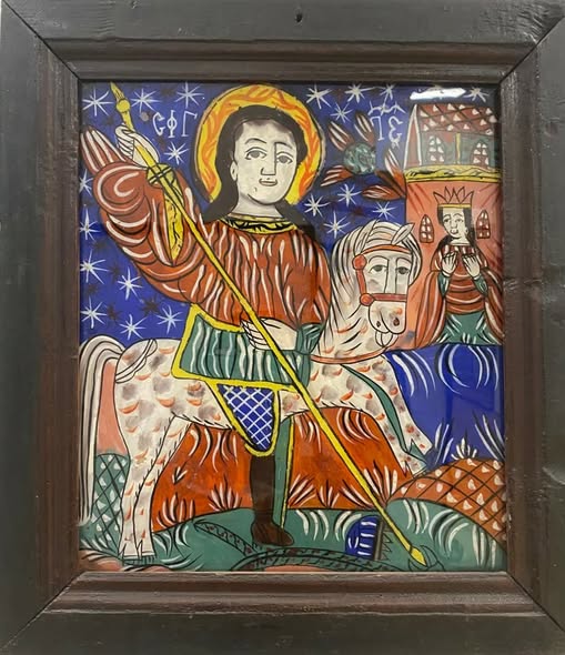 În imagine, o icoană pe sticlă cu tema „Sfântul Gheorghe”, pictată în secolul al XIX-lea într-un atelier transilvănean din Făgăraș. Icoana poate fi admirată în expoziția permanentă a Muzeului de Artă Populară Constanța.