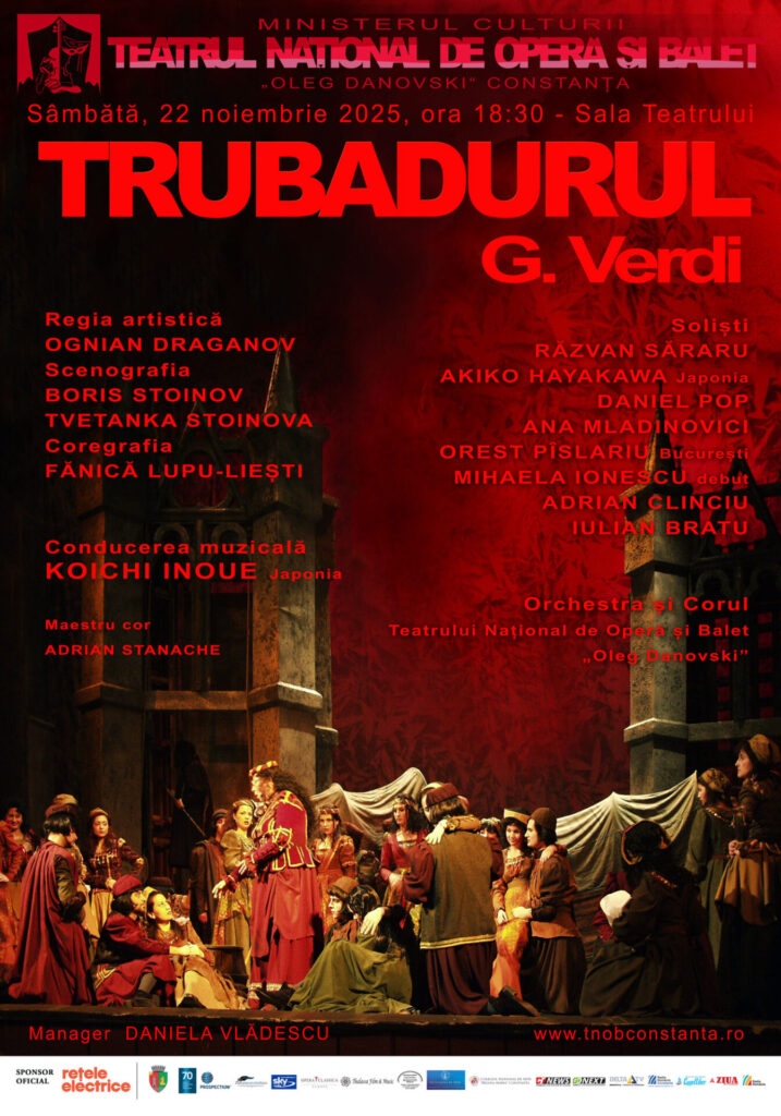 Teatrul Național de Operă și Balet „Oleg Danovski” din Constanța invită publicul sâmbătă, 22 noiembrie 2025, de la ora 18:30, la spectacolul de operă „Trubadurul” de Giuseppe Verdi, o lucrare emblematică a repertoriului liric universal.