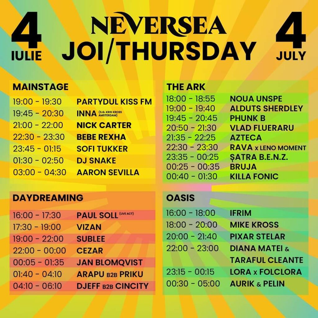 Neversea, cel mai mare festival de muzică organizat pe o plajă din Europa, a ajuns la cea de-a 6-a ediție. Anul acesta, la festivalul care va avea loc între 4 și 7 iulie în Constanța, vor ajunge peste 100 de artiști naționali și internaționali precum: Maluma, Nick Carter, G-Eazy, Bebe Rexha, Tinie Tempah, DJ Snake, Dimitri Vegas, Sofi Tukker, Steve Aoki, Mahmut Orhan, Salvatore Ganacci, Tujamo și mulți alții.