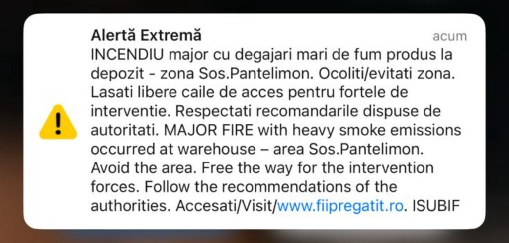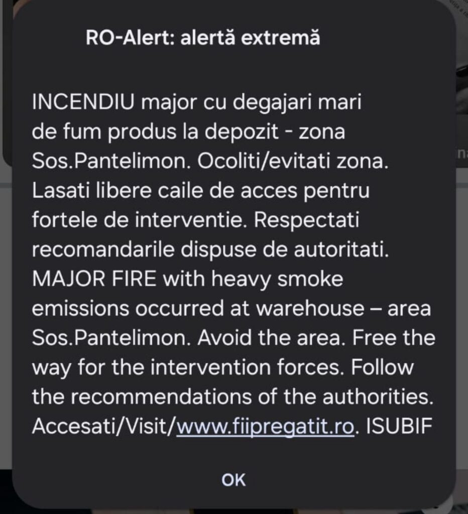 Au fost emise patru mesaje RO-Alert: pentru sectoarele 2 și 3, ulterior pentru toți locuitorii aflați pe o rază de 2 kilometri, iar la scurt timp un altul, pentru sectorul 4. Inclusiv în Ilfov a fost primit mesajul.
