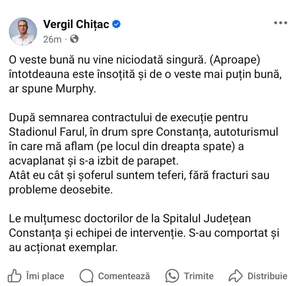 În mesajul postat pe pagina personală de Facebook, primarul Constanței nu a dat detalii despre starea sa de sănătate, însă, din informațiile pe care le deținem până la această oră, se pare că Vergil Chițac a suferit un traumatism cranio-cerebral minor.