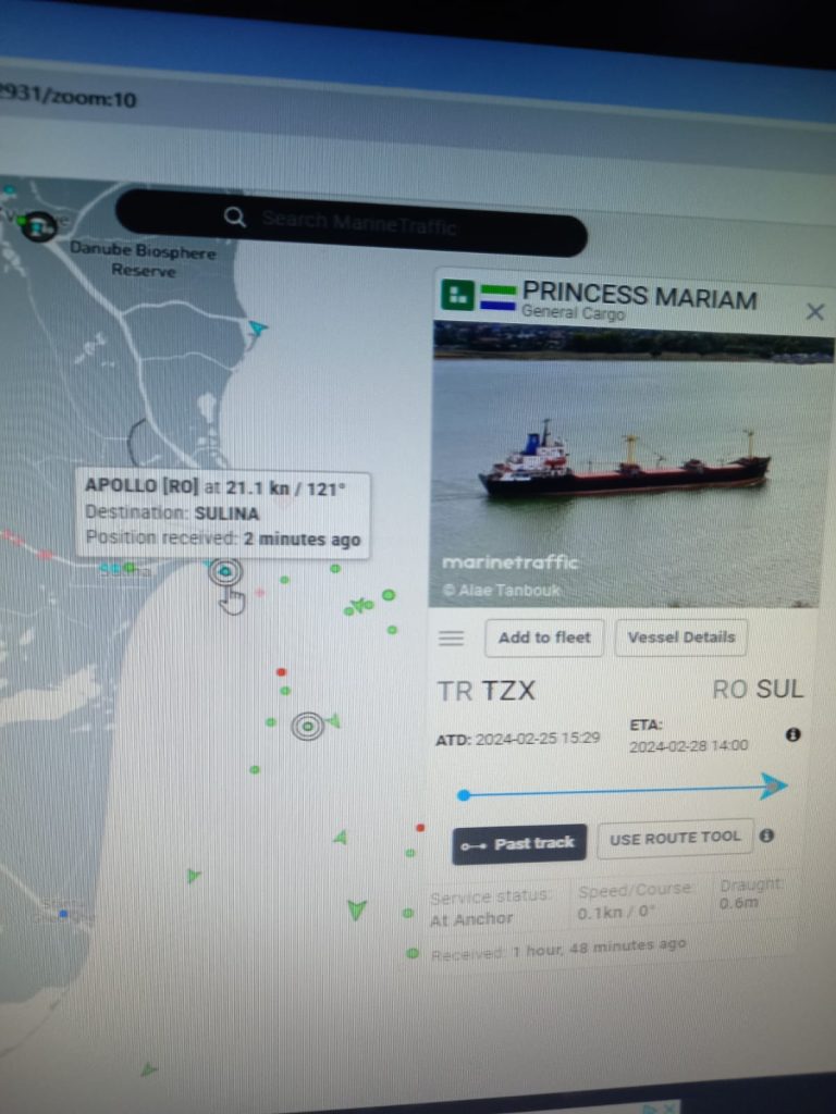 Nava efectua voiaj pe ruta Trabzon – Reni şi se afla la ancoră în rada Sulina din data de 28.02.