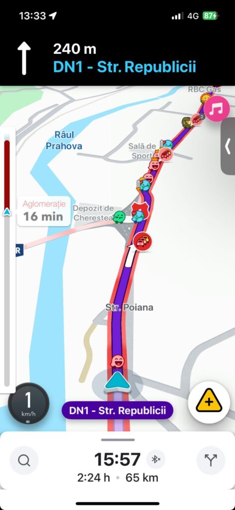 Potrivit unei aplicații de telecomunicație ghidată, pentru cei 65 de km pe care îi mai are de parcurs până la destinație trebuie să mai aibă răbdare încă două ore jumătate.