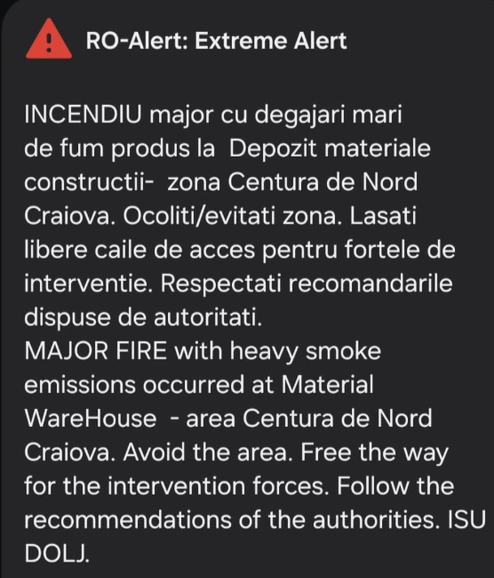Din cauza degajărilor mari de fum, a fost transmis un mesaj de avertizare a populației din zonă prin sistemul RO-ALERT.