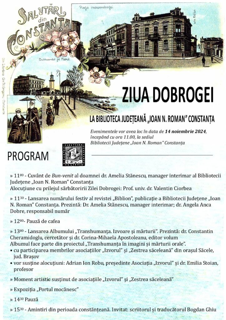 11.00 – Cuvânt de Bun-venit – dr. Amelia Stănescu, manager interimar al Bibliotecii Județene „Ioan N. Roman” Constanța; Alocuțiune cu prilejul sărbătoririi Zilei Dobrogei: istoric, prof. univ. dr. Valentin Ciorbea;