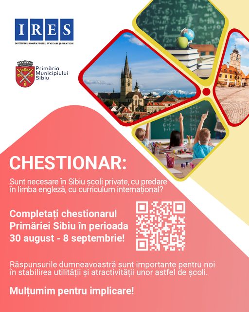 Primăria Municipiului Sibiu, prin intermediul specialiştilor Institutului Român pentru Evaluare şi Strategie (IRES), derulează în perioada 30 august – 8 septembrie un sondaj de opinie la nivelul Municipiului Sibiu cu privire la oportunitatea înfiinţării de şcoli private cu predare în limba engleză, cu un curriculum internaţional, de către entităţi dispuse să investească.
