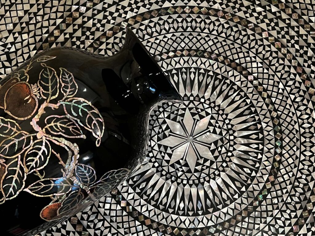Pentru prețul de 2.000 de euro este scoasă la licitație o impresionantă masă orientală din lemn exotic sculptat cu intarsii de sidef. Piesa a fost dăruită, la sfârșitul anilor 70’, de către șahul Iranului Mohammad Reza Pahlavi, cel care i-a dăruit lui Nicolae Ceaușescu și celebra limuzină Paykan Hillman Hunter, un simbol al Iranului. Limuzina a fost scoasă la licitație în 2021 și a fost adjudecată pentru 95.000 de euro. Masa de colecție este însoțită de certificatul R.A.A.P.P.S., care atestă faptul că provine din fondul de bunuri personale confiscate de la soții Nicolae și Elena Ceaușescu, precum și din cadourile intrate în proprietatea privată a statului, supuse vânzării prin licitație publică.