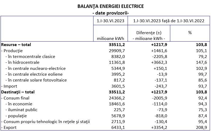 Resursele de energie electrică au fost de 33511,2 milioane kWh, în creștere cu 1217,9 milioane kWh faţă de perioada corespunzătoare a anului 2022.