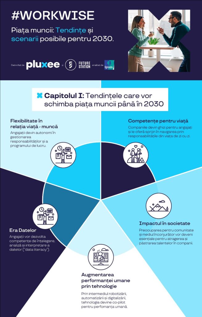 Pluxee România, liderul în soluții globale pentru creșterea implicării și motivării angajaților, alături de FutureStation și Ipsos România, lansează azi concluziile primului studiu din seria #WorkWise, o radiografie detaliată a principalelor tendințe care pot schimba piața muncii până în 2030. Realizat pe baza unei metodologii complexe, care combină analiza de scenarii cu cercetări cantitative, studiul identifică principalele tendințe care pot determina felul în care vom lucra până în 2030, în viziunea angajaților români dar și a specialiștilor.