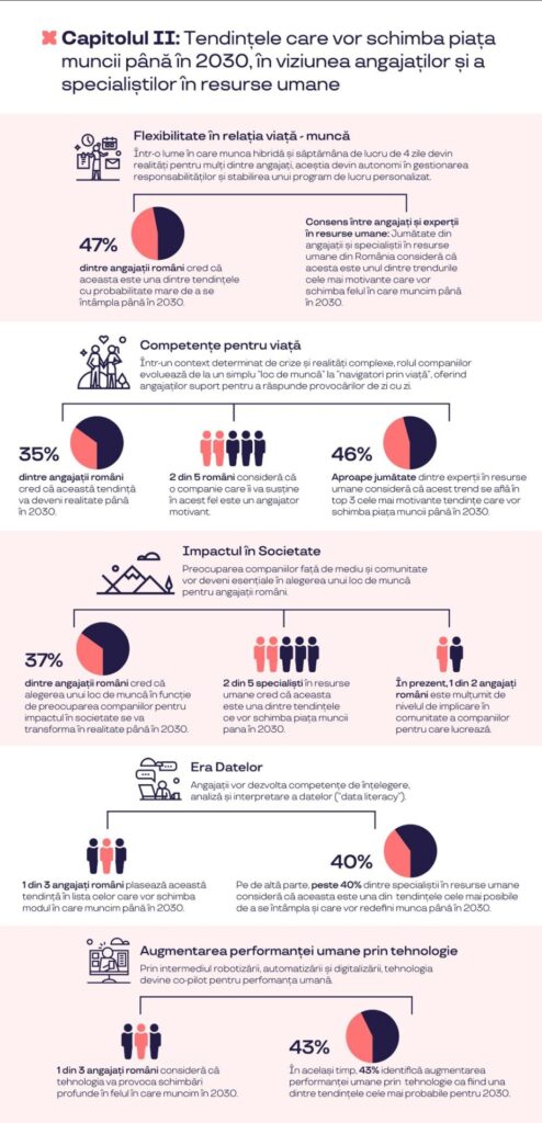 37% dintre angajații români cred că alegerea unui loc de muncă în funcție de preocuparea companiilor pentru impactul în societate se va transforma în realitate până în 2030. 2 din 5 specialiști în resurse umane cred că aceasta este una dintre tendințele ce vor schimba piața muncii până în 2030.