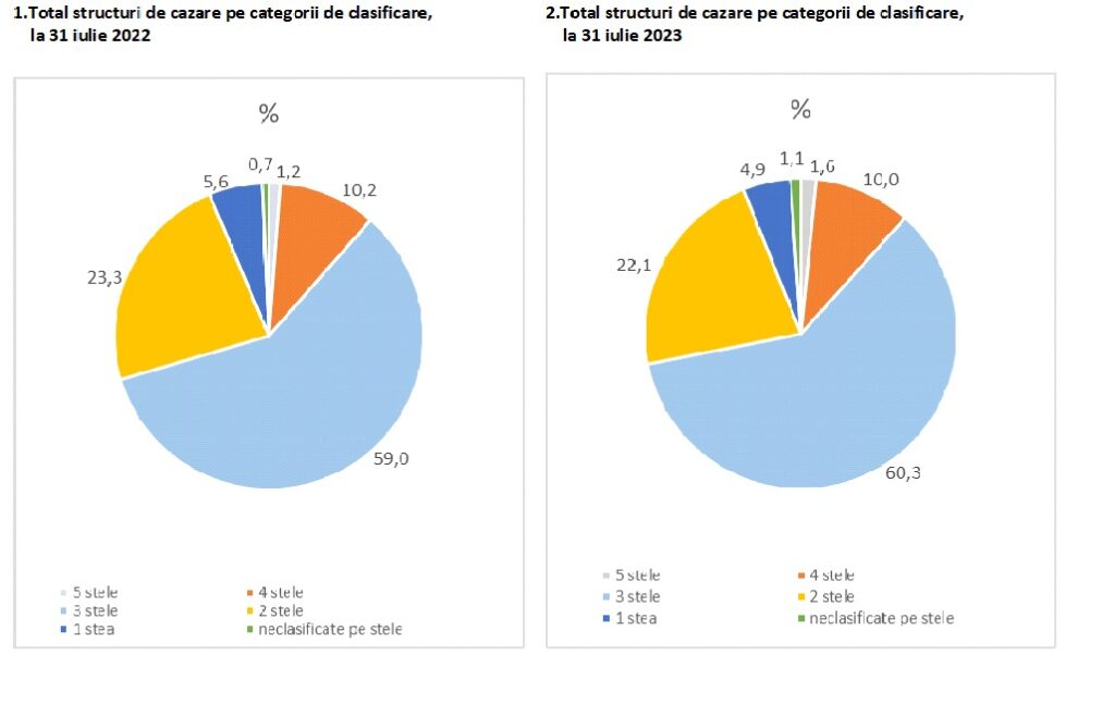 Cele mai multe hoteluri erau încadrate la categoria 3 stele (54,5% din total hoteluri), 4 stele (25,6%) şi 2 stele (15,4%). Hotelurile cu 5 stele au fost în număr de 44, (cu 8 mai multe față de 31 iulie 2022), arată datele oferite de Institutul Național de Statistică.