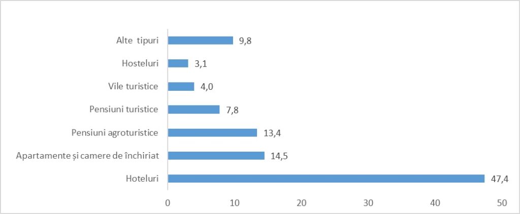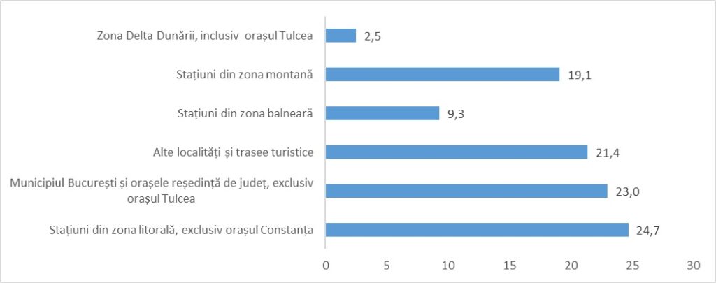 Din structurile de primire turistică cu funcţiuni de cazare turistică (inclusiv apartamente și camere de închiriat), 29,1% au fost în „staţiunile din zona montană”, 16,2% în „Municipiul Bucureşti şi orașele reședinţă de județ (exclusiv oraşul Tulcea)”, 10,9% în „staţiunile din zona litorală (exclusiv oraşul Constanţa)”, 7,4% în „staţiunile balneare”, 3,9% în „Delta Dunării (inclusiv oraşul Tulcea)”, iar 32,7% au fost în „alte localități şi trasee turistice”.