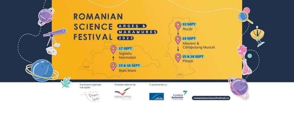 În perioada 13 – 17 septembrie, Romanian Science Festival va vizita şapte localităţi în două judeţe: Argeş – Piteşti, Mioveni, Câmpulung Muscel, Rucăr și Maramureş – Baia Mare, Sighetu Marmaţiei şi Breb.