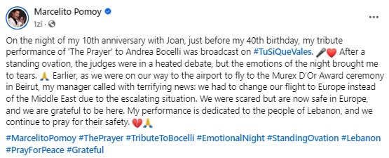 În urmă cu o zi, Macelito a scris pe pagina sa de Facebook: „În seara aniversării noastre de 10 ani, chiar înainte de a împlini 40 de ani, interpretarea mea omagială a piesei „The Prayer” pentru Andrea Bocelli a fost difuzată la #TuSiQueVales. După o ovație în picioare, jurații au avut o dezbatere aprinsă, dar emoțiile serii m-au făcut să plâng. (…) Interpretarea mea este dedicată poporului libanez, iar noi continuăm să ne rugăm pentru siguranța lor.”